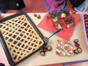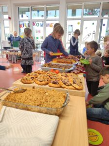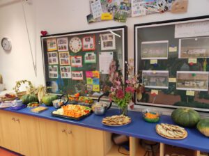 Unser Elternbeirat und weitere helfende Eltern haben aus dem vielfältigen Ernteangebot ein tolles Buffet mit Gemüsesticks, Zucchini- und Apfelkuchen, Kürbis- und Kartoffelsuppe und vielen weiteren Leckereien für die Kinder gezaubert. Vielen Dank!